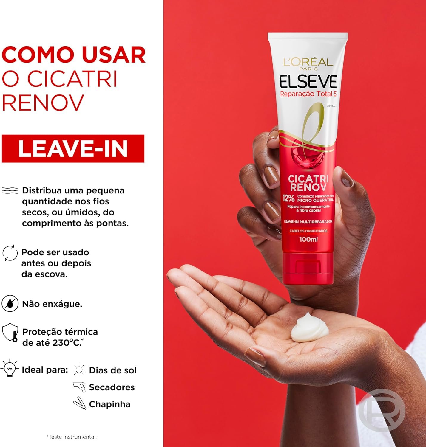 O Leave-In Cicatri Renov Elseve Reparação Total 5 identifica e repara os danos fio a fio do cabelo sem pesar. Ele trata os fios instantaneamente sem pesar. Possui 10 benefícios para uma plástica capilar: reparação instantânea; selagem das pontas; 100% mais brilho; maciez profunda; toque deslizante; desembaraço imediato; 10x menos quebra; anti-frizz; anti-umidade e proteção térmica. Para todos os tipos de cabelo, renova e protege a qualquer hora e em qualquer lugar. Pode ser usado com o cabelo seco ou molhado, antes ou depois do secador.