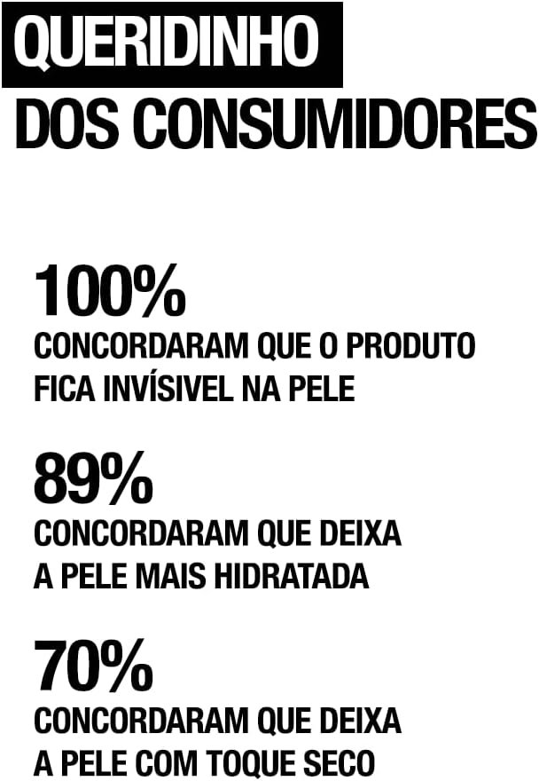 - Rápida absorção; 100% invisível na pele; muito resistente a água e suor; textura oil-free; ultraleve como hidratante
