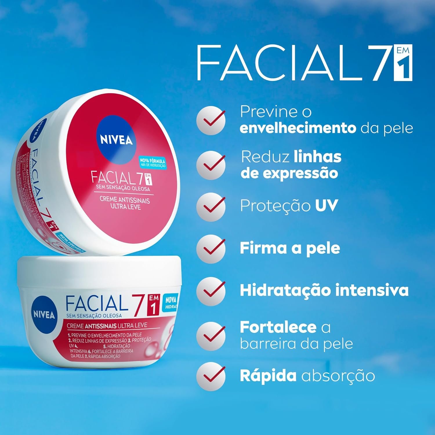 - PREVINE O ENVELHECIMENTO: O NIVEA Creme Facial Antissinais Ultraleve 7 em 1 ajuda a proteger a pele contra sinais visíveis do tempo, como perda de firmeza e textura irregular. Sua fórmula avançada combate fatores externos que aceleram o envelhecimento, promovendo pele com aspecto mais saudável e cuidado diário completo.